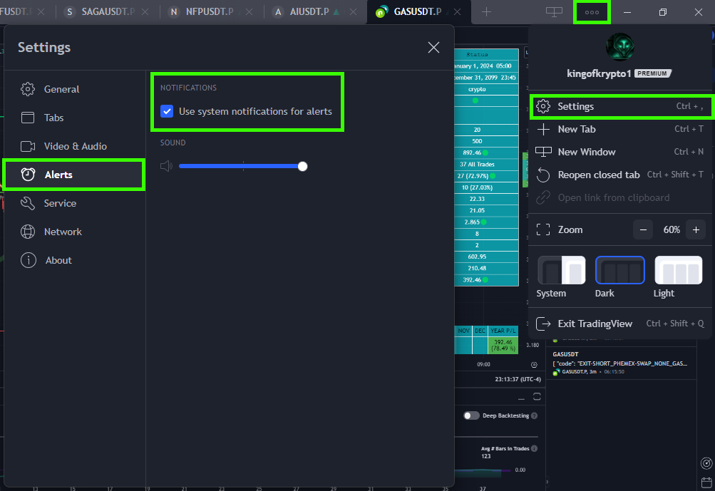 You want to make sure you have Notifications enabled on your system, browser, and Tradingview, so your TV **alerts** fire properly and send signals to your bot or exchange, when using the GBRMBPro script. &#x20;