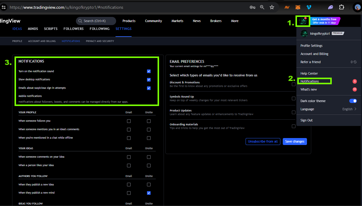 ### How to turn on Notifications in your Tradingview Acount settings